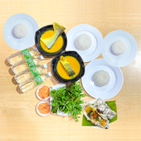 Nasi Putih 6, Patin Sangkar Tempoyak 2, Patin Sangkar Goreng 2, Ayam Kampung Goreng 2, Ulam Daun 4, Sambal Tempoyak 3, dan Air Mineral 6