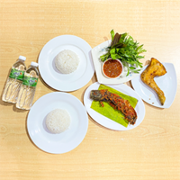 Nasi Putih 2, Ayam Kampung Goreng 1, Patin Sangkar Goreng 1, Ulam Daun 1, Sambal Belacan 1, dan Air Mineral 2