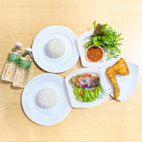 Nasi Putih 2, Patin Sangkar Tempoyak 1, Pais Patin 1, Ulam Daun 1, Sambal Belacan 1, dan Air Mineral 2