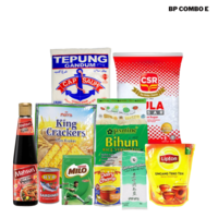 Gula CSR 1kg, Susu Pekat Dairy Champ, Milo 200g, Morris King Cream Cracker, Garam 450g, Sardin HYH 155g, Lipton Uncang Teh, Mahsuri Kicap Manis Pedas, Bihun Jasmine dan Tepung Gandum Cap Sauh