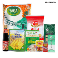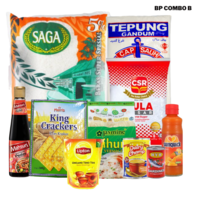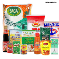 Beras Saga 5kg, Gula CSR 1kg, Susu Pekat Dairy Champ, Milo 200g, Morris King Cream Cracker, Garam 450g, Sardin HYH 155g, Kopi 200g, Lipton Uncang Teh, Mahsuri Kicap Manis Pedas, Sunquick Oren 330ml, Bihun Jasmine, dan Tepung Gandum Cap Sauh.